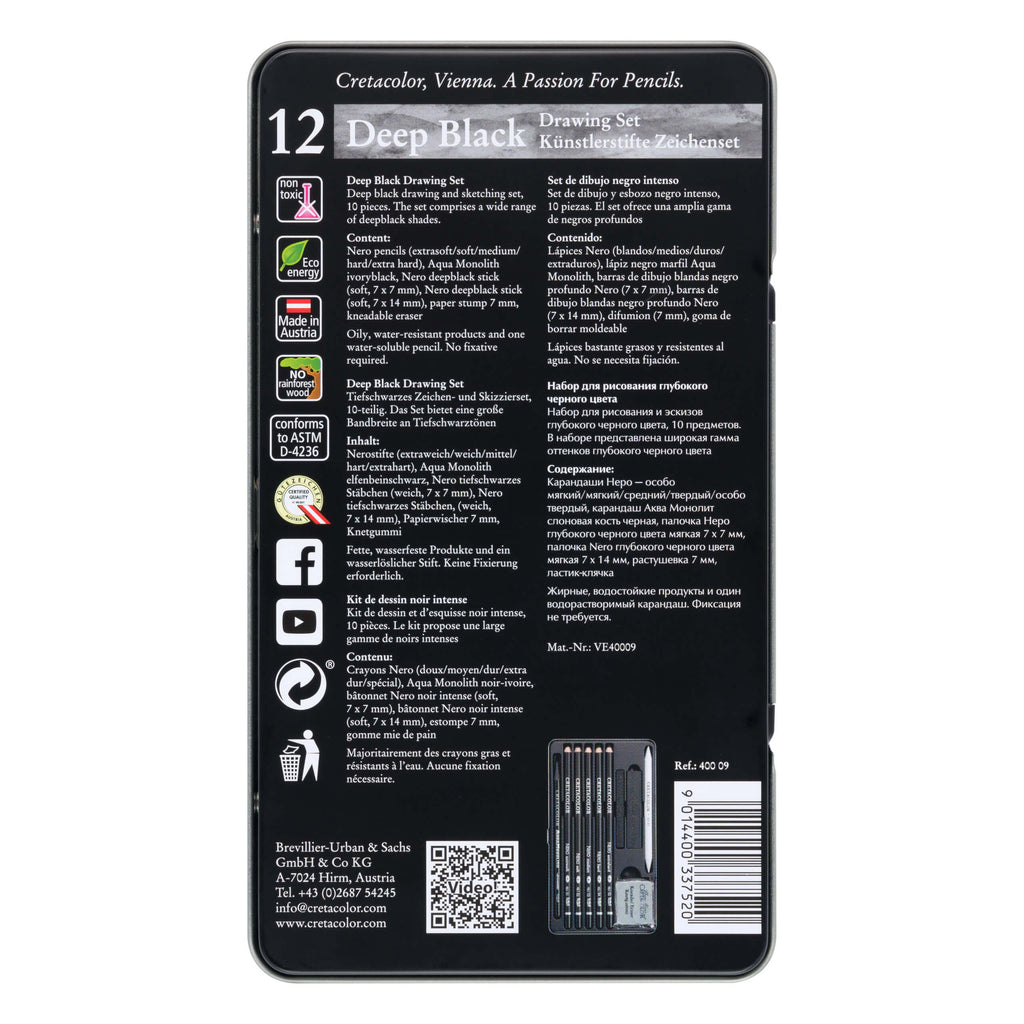 For artists who demand the most intense, velvety blacks, the Cretacolor Nero Deep Black Set is the ultimate toolkit. This specialized 10-piece collection is built around the unique Nero formula—a blend of oil and carbon that produces exceptionally rich, deep black marks. Combining water-resistant pencils and sticks with a water-soluble Aqua Monolith, this set offers incredible versatility for dramatic drawing and mixed media.