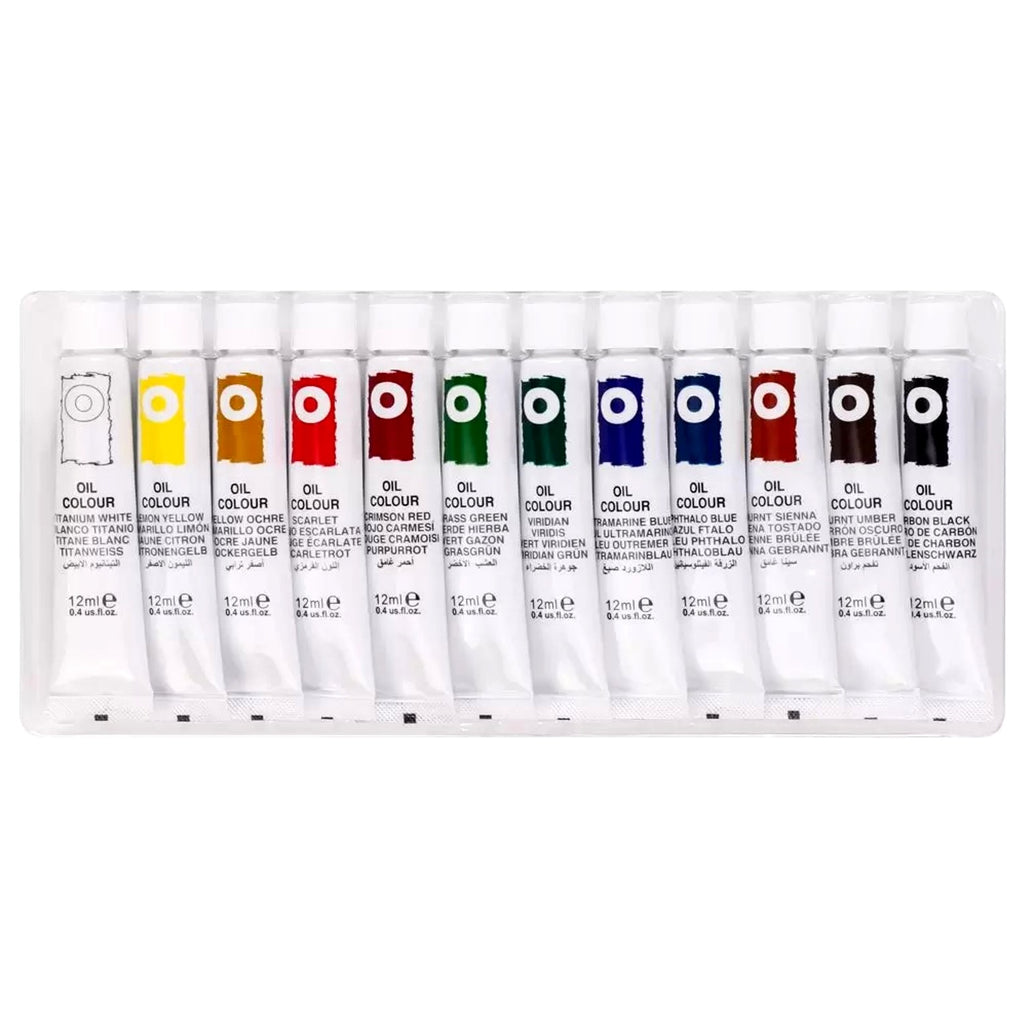 - Colours in each set: Titanium White, Lemon Yellow, Yellow Ochre, Scarlet, Crimson Red, Grass Green, Viridian Blue, Ultramarine Blue, Phthalo Blue, Burnt Sienna, Burnt Umber and Carbon Black