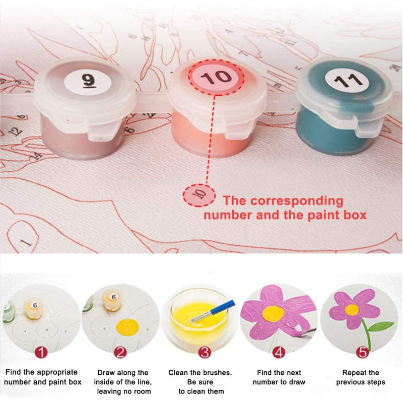 - 1 set of paints (enough to colour entire canvas). Colours included vary based on each design