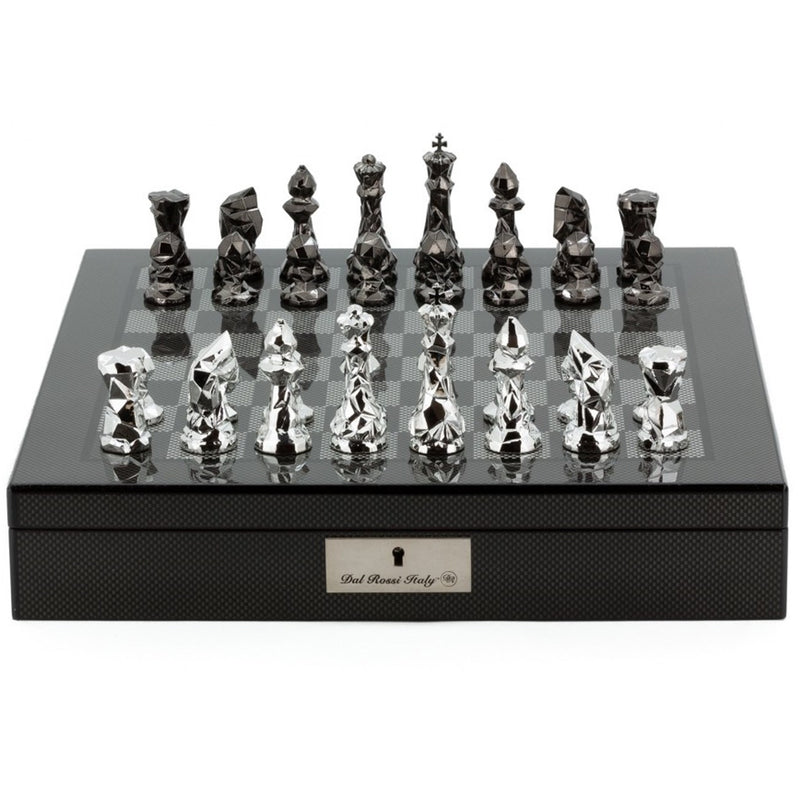 Dal Rossi Diamond Cut Silver Titanium Chess Set on 16" Carbon Fibre Finish Board