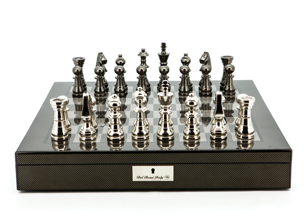 Dal Rossi Italy Metal Dark Titanium & Silver Chess Set on 20" Carbon Fibre Shiny Finish Board