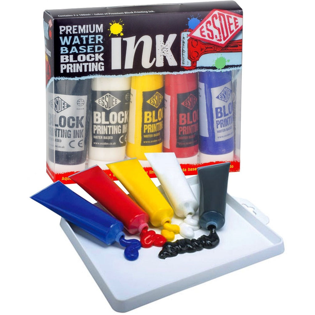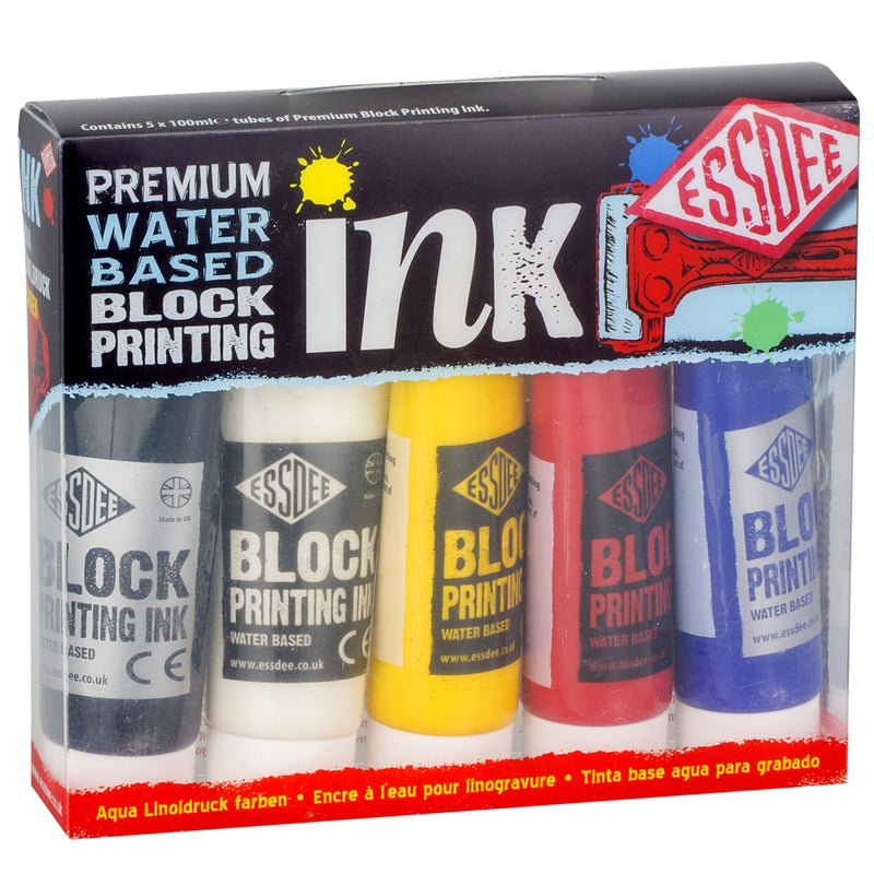 - Your new set contains 5 tubes of block printing ink in the following colours: Blue, Red, White, Yellow and Black.