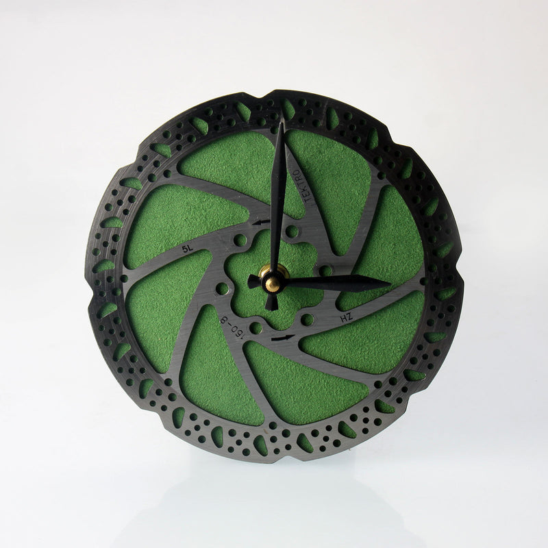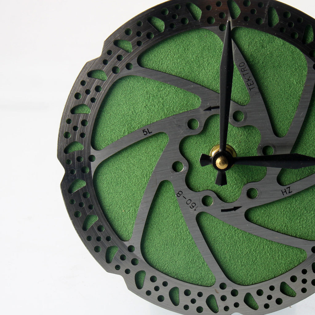 - This clock is handmade from recycled Bicycle Disc Rotor with green up cycled upholstery fabric backing and is finished with black clock hands .
